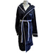Black hooded robe in super soft fleece toweling with white piping & belt, with logo on breast and back.