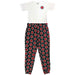High quality ladies pyjamas featuring contrasting top and bottoms. With front printing to top and all over motif print to pants.