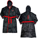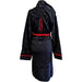 Black super soft fleece hooded robe in towelling with red piping & belt. Logo on breast and back.