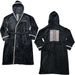 Black super soft fleece hooded robe with contrasting white piping & belt. Features embroidered design motifs to front & back.